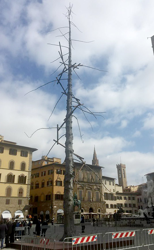 L’abete di Penone alto oltre 22 metri al centro di piazza Signoria, il restauro del Cenotafio all’interno della Basilica di Santa Croce con letture della Commedia affidate a Monica Guerritore e una originalissima mostra di Corrado Veneziano alla Biblioteca Nazionale, ISBN Dante, impreziosita dall’esclusivo abito realizzato dalla stilista internazionale ma fiorentina d’adozione Regina Schrecker e dedicato a una delle figure femminili più note del poema, Francesca da Rimini. Ma il significato più autentico e forse in qualche modo anche più dantesco della giornata dedicata al Sommo Poeta, che coincideva anche con il Capodanno Fiorentino, è probabilmente tutto racchiuso in una battuta graffiante in puro stile fiorentino di un anziano che arrivato fin sotto l’installazione di Penone alla domanda su quale fosse il rapporto tra l’Abete e Dante sagacemente ha risposto: “E son morti tutti e due!”.